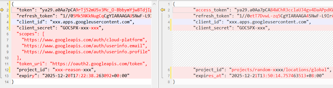 done-hub 接入 Antigravity 部分交互及代码参考 gcli2api,感谢 gcli2api 的贡献。另外 2 个项目 OAuth 的格式有点区别,左边是 gcli2api、右边是 done-hub。